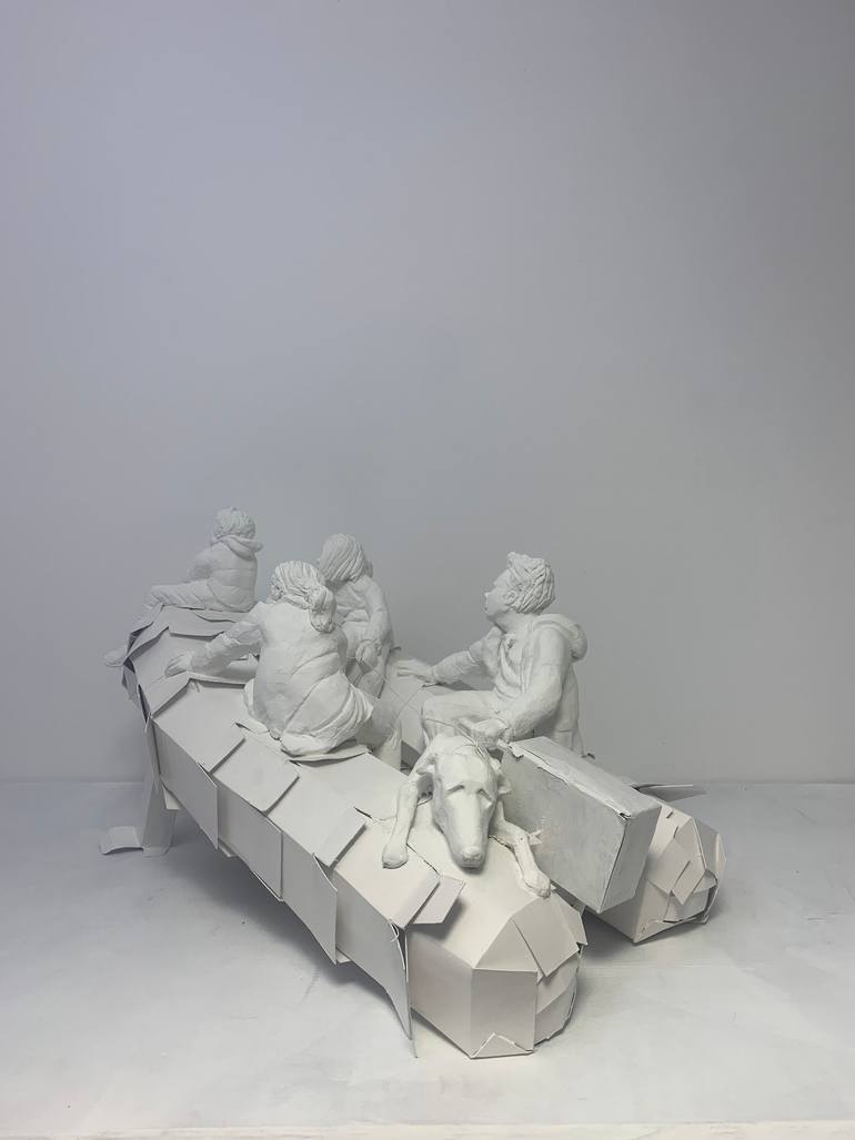 'Leaving Happy Island' belongs to a series of 8 sculptures called 'Happy Island' made between 2018 and 2021 and exhibited several times in 2021 and 2022. Happy Island is a report of an imaginary family trip to a deserted island. In this piece, te spectator sees the family leaving the Island.