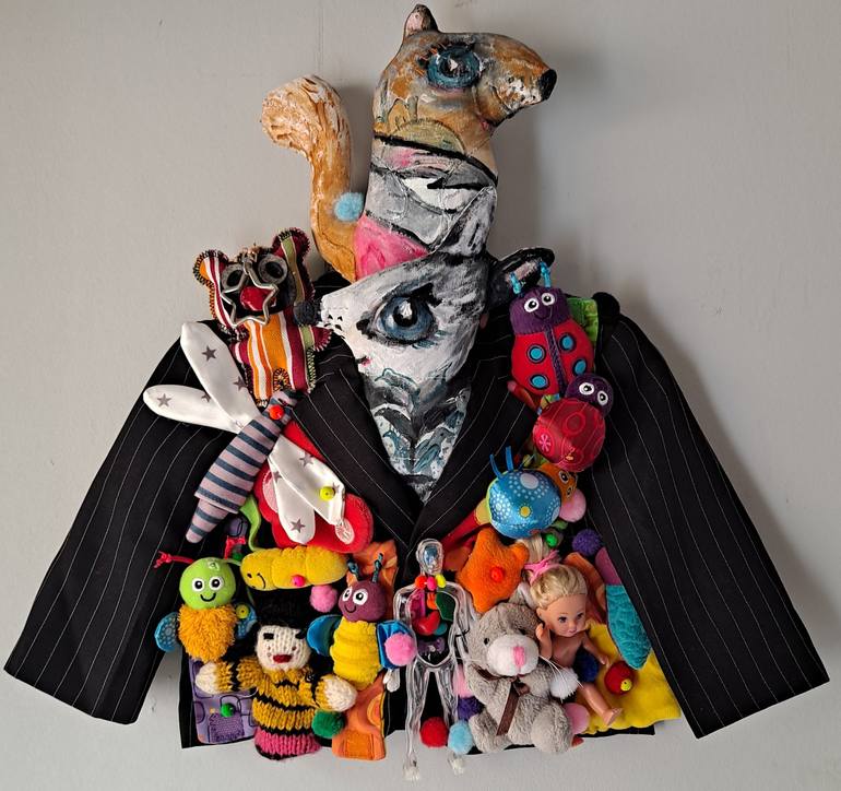 Looking for colored joyfull world. All stuffedtoys were washed before use. Sewing on a Child blazer. 2 stuffedtoys with acrylic painting. Very contemporean and original. Ready to hang. Pay respect to any animals.