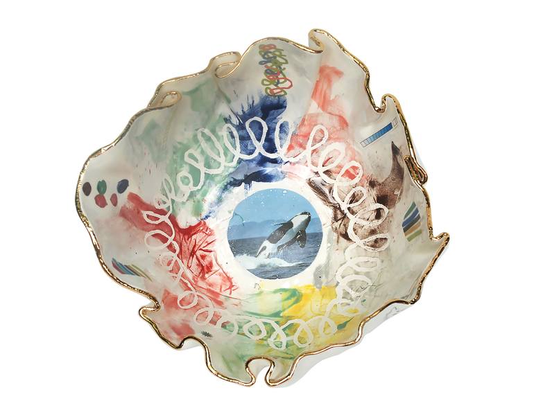 A homage to grecian and Egyptian pottery with pictures of an orca and gold bits. Also two dog owners flirting via their dogs