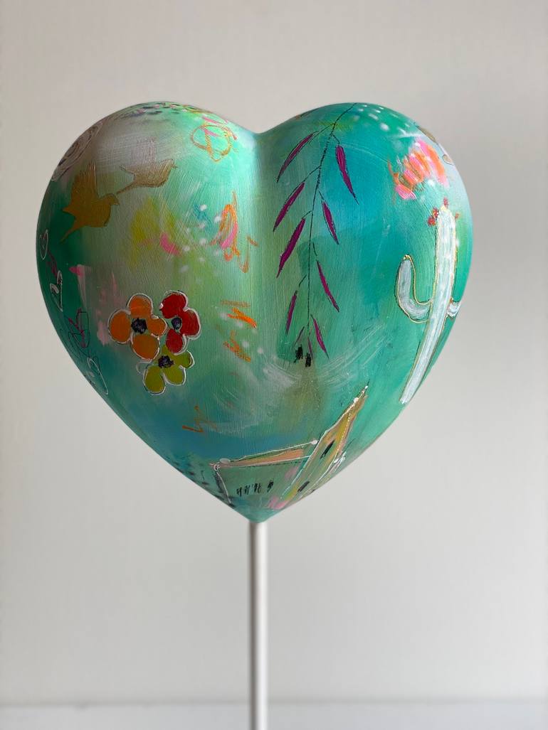 This colorful blue turquoise heart sculpture is made out of fiberglass and resin. The stand is metal painted in white. It has a wonderful round form. Signed on the heart. I painted the heart with high quality acrylics, soft pastels, neon oil pastels and spray paint. It is varnished for protection ag...