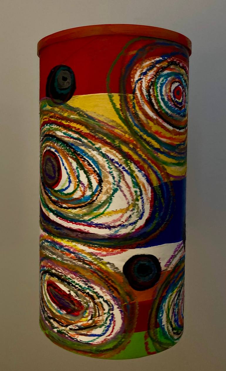 Alexander Calder, Cy Twombly, Frank Stella and Phyllida Barlow were artists that inspired me. I want the viewer to see the explosive color energy moving as the sculpture turns slowly. I chose a cardboard container with a plastic lid because of its lightweight qualities and mobility. Hanging hardwa...