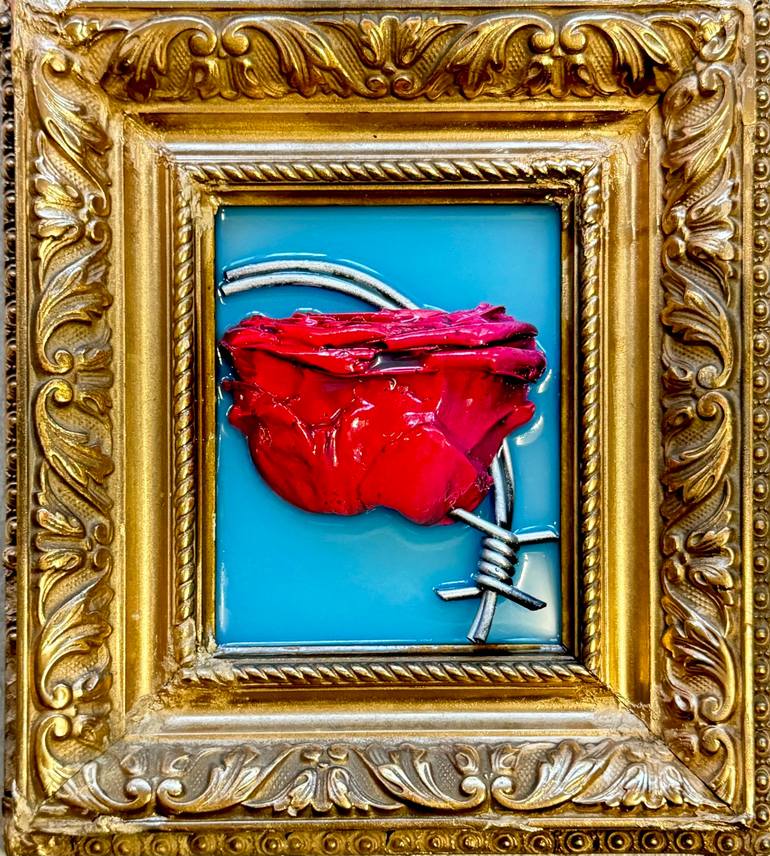 This work is from a serie," Peau à Peau", exploring love with 3d printing, sculpting and mold of real life element like this red rose with a vintage antique decorative frame.