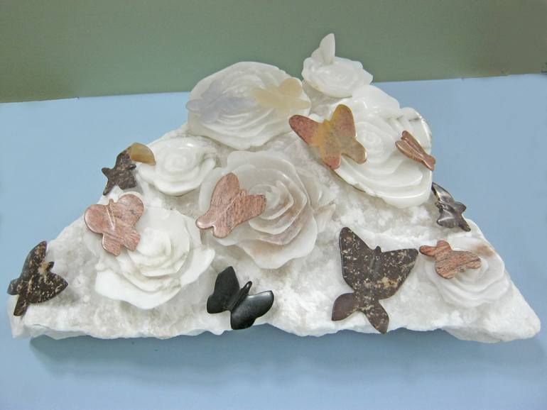 Stone butterflies on the magic flowers. The flowers are individually made of alabaster and were subsequently placed on the rock. The butterflies are made of alabaster and galastone.