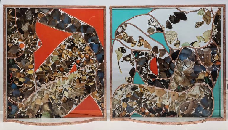 This work explores the archetypal myth of Adam and Eve through an innovative visual language, based on the integration of colored glass and butterfly wings using an original technology Milleali. The composition is divided into two distinct panels: the female figure appears fully formed, full of matt...