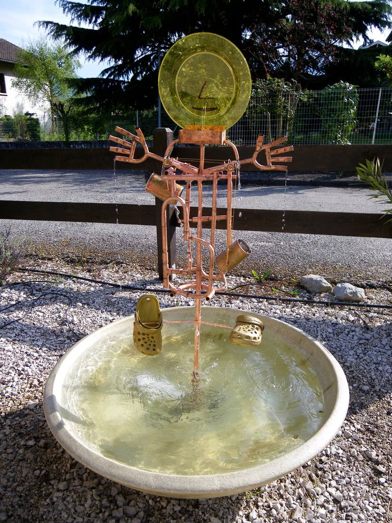 Water jet hits plate and runs into two cans which move up and down randomly, emptying their content onto rotation crocs. Materials:plastic plates, cans, crocs, copper, waterpump, solar panel.