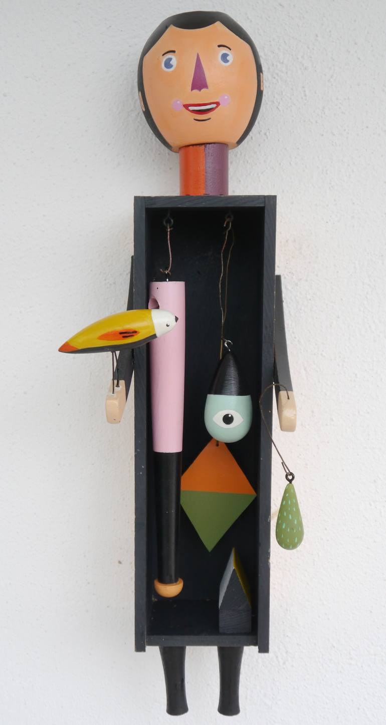Acrylic paint and spray paint on vintage wooden pieces and handmade polymer clay figures. 47 H x W 11 x D 16 cm Metal hanger on the back side. Parts of the sculpture are flexible and would be demounted for a safer shipping.