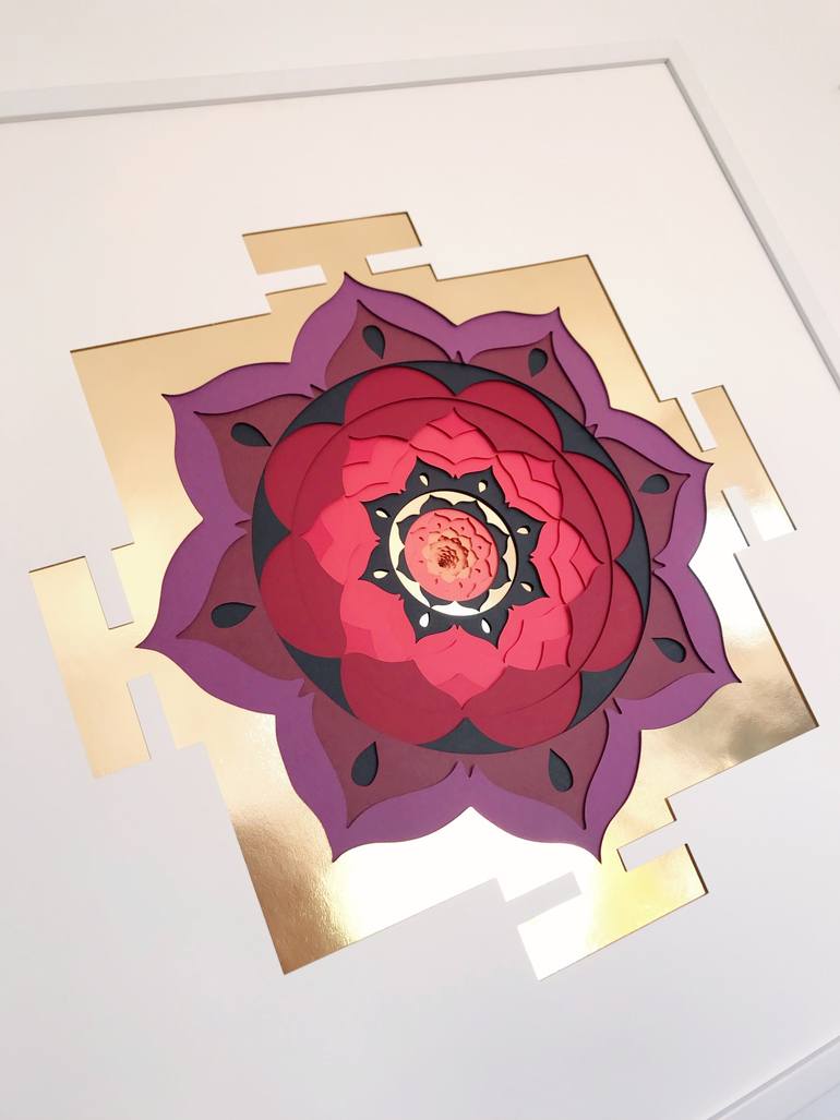 'Mandalishious' is a giant 3D layered paper mandala. 'Mandala' means circle in Sanskrit and these circular images are used for personal development and for focusing the mind during meditation. The four T shapes are the gates to the palace in which lies the treasures of the universe or your own mind...