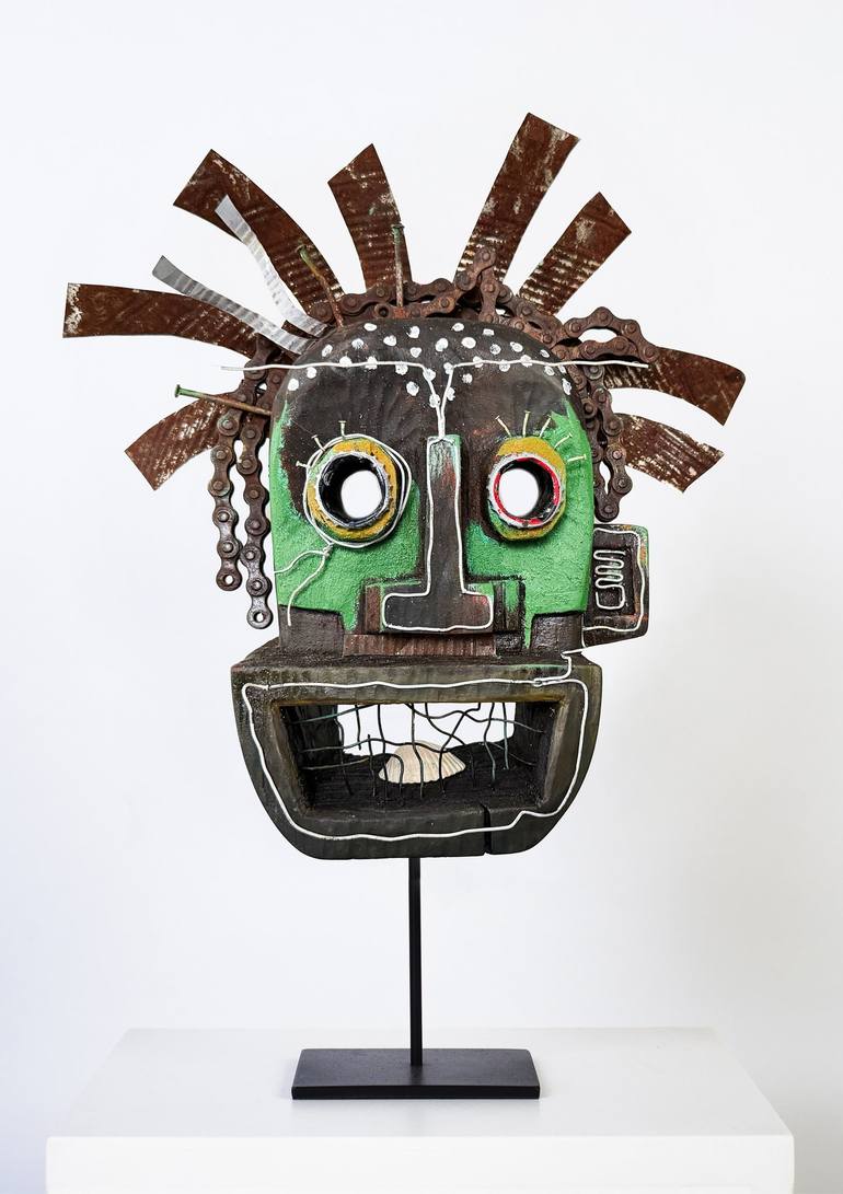 This work was inspired by Basquiat's paintings and African mask making in Ghana. My masks symbolize the spirit of a long lost talent. Wood, cans, old beer caps and rusted bicycle parts picked up off the streets in Amsterdam gives a new meaning to street art. This mask on a metal stand looks great in...