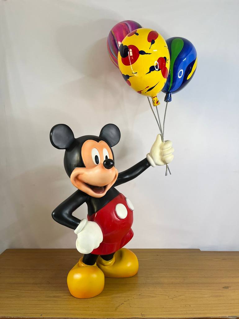 Mickey mouse sculpture with three of our signature patterned balloons held in its hand.