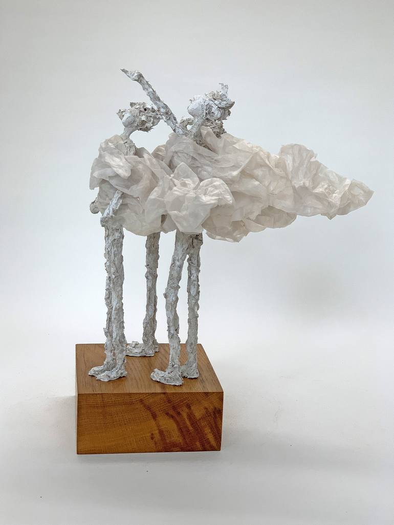 Bright sculpture group made of paper mache with waving robes in the wind. A offfwhite sculpture group from the edition "I see the wind". The sculpture was mounted on a base of solid oiled oak. One of akind artwork. My sculptures are very robust despite their filigree appearance. Edition: I see t...