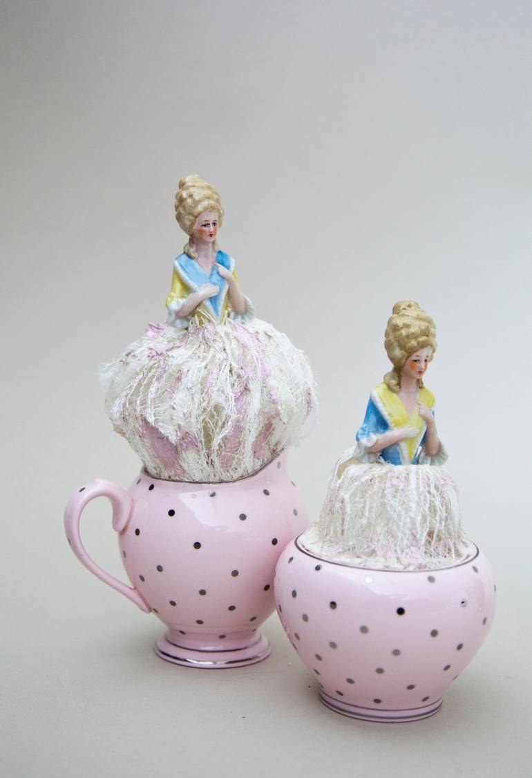 Two lady figures stand in a pink jug and bowl in this conceptual artwork.