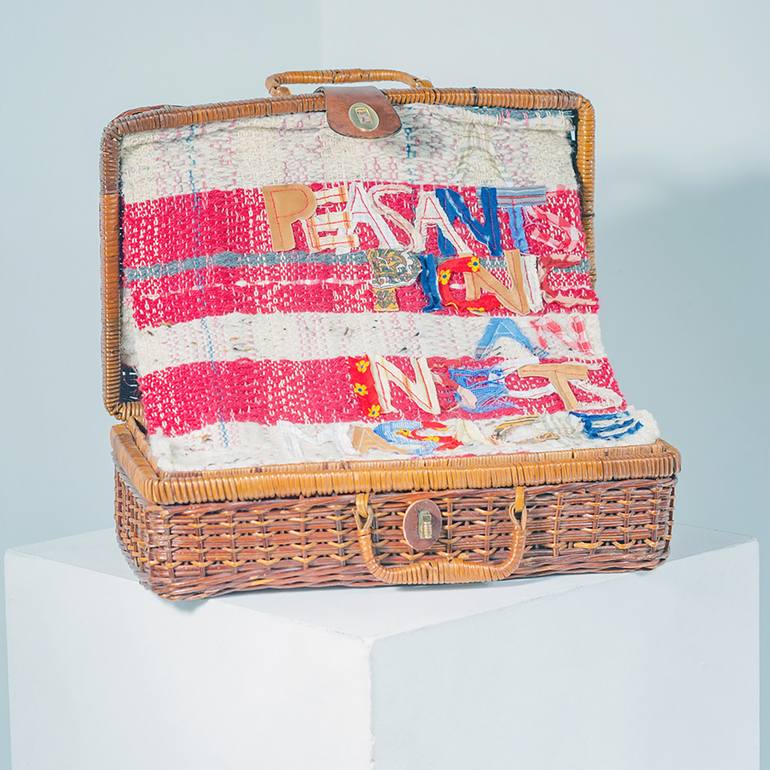 Late 1800’s American Coverlet overshot draft pattern woven with a linen warp dyed with cochineal and cotton weft, installed in a vintage picnic basket. Fabric letters sewn directly to weaving reads “A PEASANT’S PICNIC/ AN INSECT’S MASSACRE”.