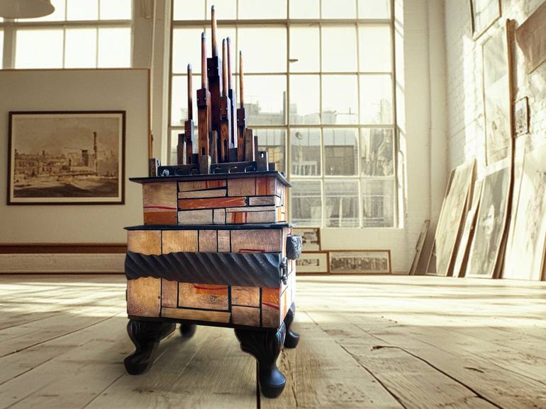 Mirage rises like a distant metropolis in the desert, or an ancient artifact uncovered by a sandstorm, its form evoking both mystery and wonder. A moderately weighty, floor-standing sculpture, it draws on materials from across the globe—American, Indian, and Japanese influences, alongside recycled Q...