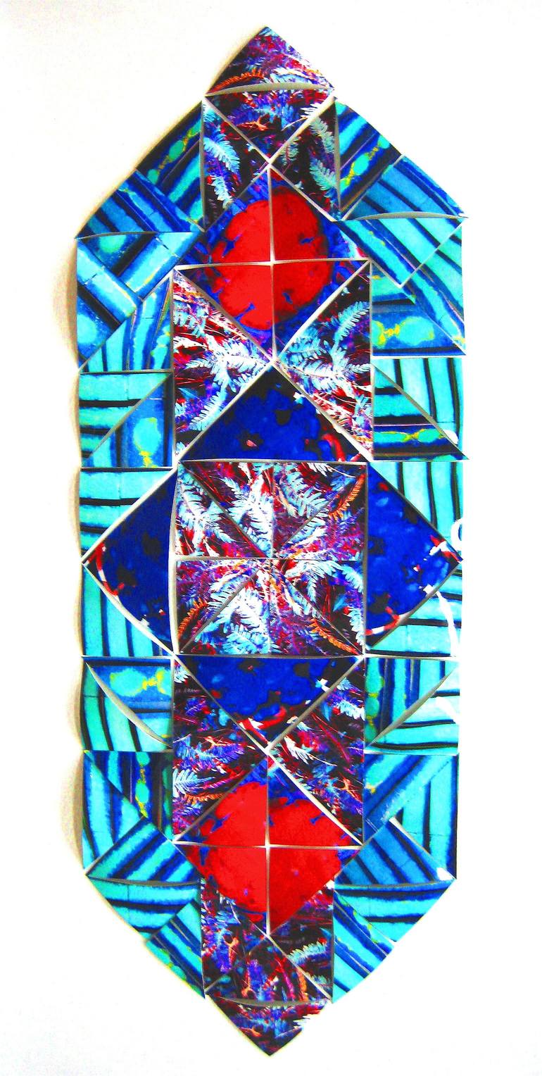 This piece takes the the opposite colours of red and green to create maximum contrast . I cut the manipulated photographs into triangles and gently curve, attaching to a white backing board, . Thus making a 3D constructed photograph based on cubist ideas and removing the single view point by fragme...