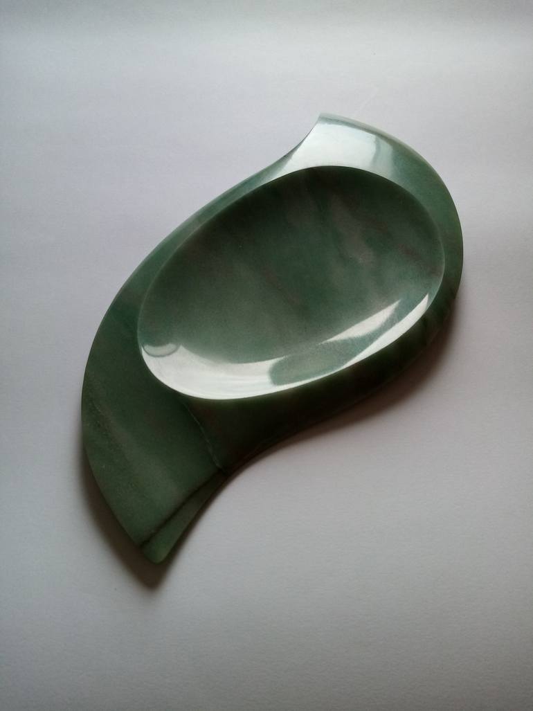 This piece is quartzite with darker colored veins than the green that predominates. Given the hardness, the work including polishing was done with diamond tools. The whole surface is uniformly smooth and polished. The artwork is unsigned, please request if so specifying where.