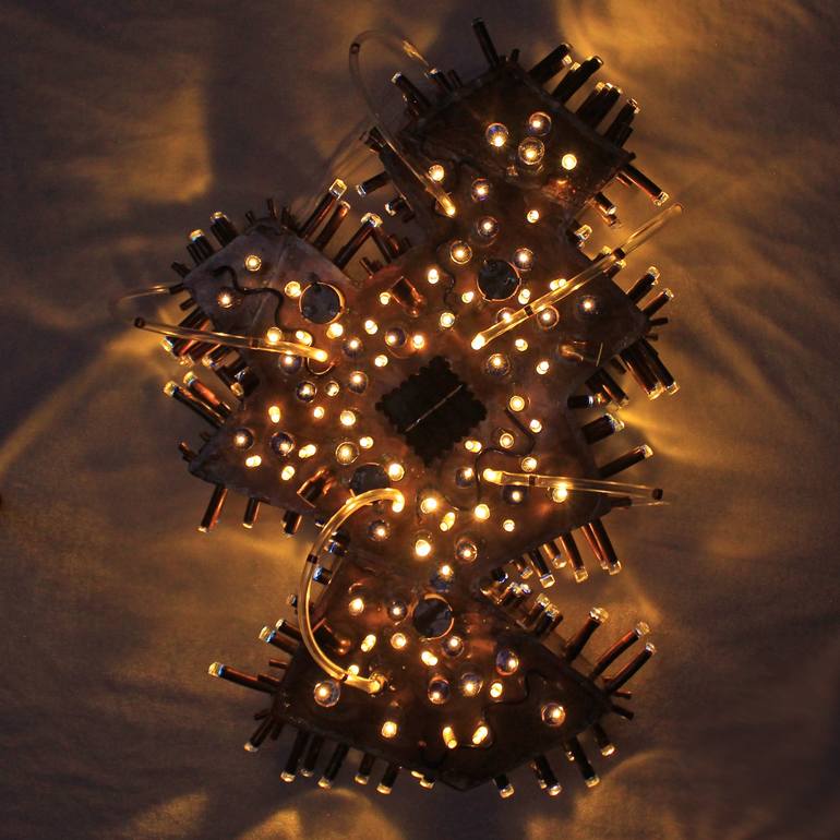 Copper Abstract Wall Sculpture with Light 100% original hand-created one-of-a-kind sculpture by Tanbelia. 'Morning Dew' Size 24 x 16 x 6 inches (61 x 40 х 15 cm). Materials: copper, solar battery light, pvc. You can hang it on the hook on the screws, or nails or hang it by a string. The weight is...