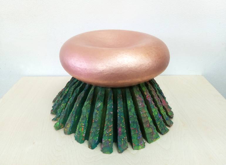 I made copper part for the first. I like copper surface round and smooth by hammering it. And while I'm looking at it I felt I should make something green like mountain and put the copper part on top. The idea comes from abstract combination of shape, color, and materials.
