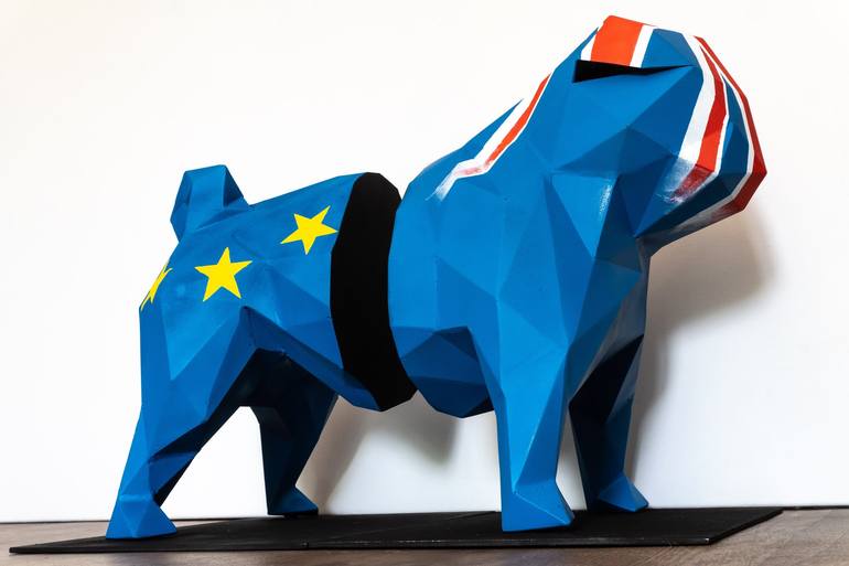This bold and original sculpture powerfully symbolizes the division between the European Union and the United Kingdom, reflecting the tension of Brexit. The artist brilliantly captures this theme through the figure of a bulldog, a symbol of British strength, with one half painted in the EU's iconic ...