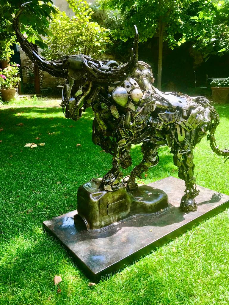 Sculpture, steel parts, metal base, 2012 Nguni cattle are a traditional breed of cattle indigenous to the southern regions of Africa, particularly South Africa. They are renowned for their striking and diverse coat patterns, which include a variety of colors and markings. These cattle are highly va...