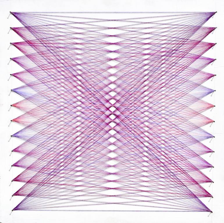 Artwork shipped framed, ready to hang. Framed in a white wooden frame, packed safely in a wooden crate and shipped framed. "Nailed it Series" is inspired from geometric shapes and the mathematics of weaving thread around the nails as it forms beautiful psychedelic patterns. It done on 9mm plywood an...