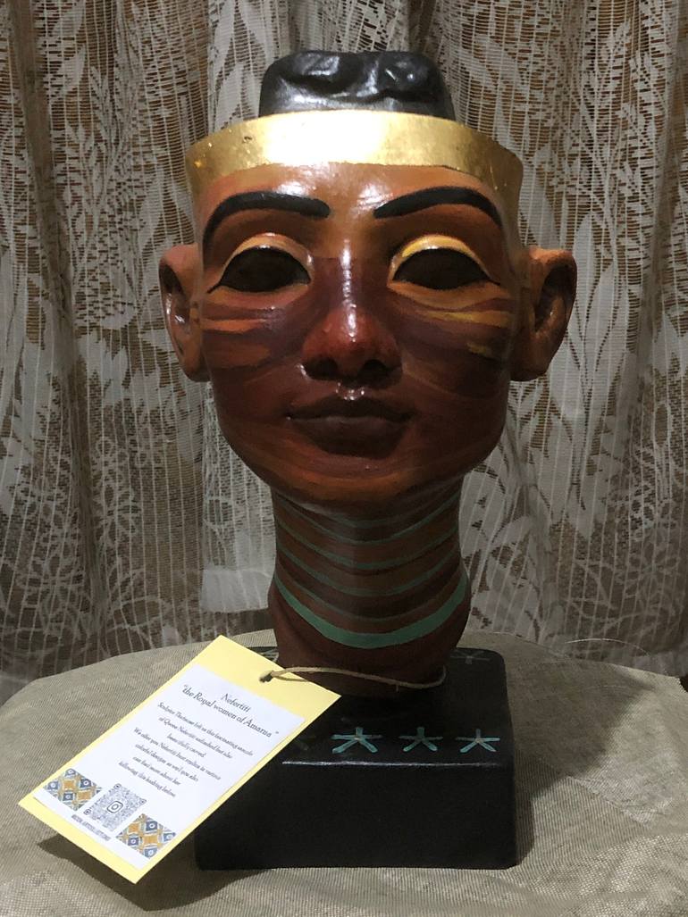 The Royal women of Amarna -Nefertiti bust Sculptor Thutmos left us this fascinating sample of Queen Nefertiti unfinished, but also beautifully carved ! Offering you this limited product « Nefertiti bust «  replica in various colored designs glorified with gold leaves . Ask for your customized piec...