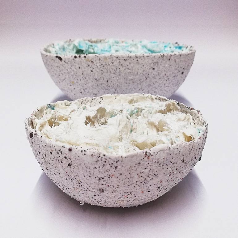 "Nidis ceruleae" is a sculpture in white porcelain and colored glass, fired in single firing at 1260 ° C, consisting of two porcelain hemispheres mixed with sand filled with a very light filamented porcelain material. Inside, rare glassy drops pigmented in blue evoke possible geochemical processes o...