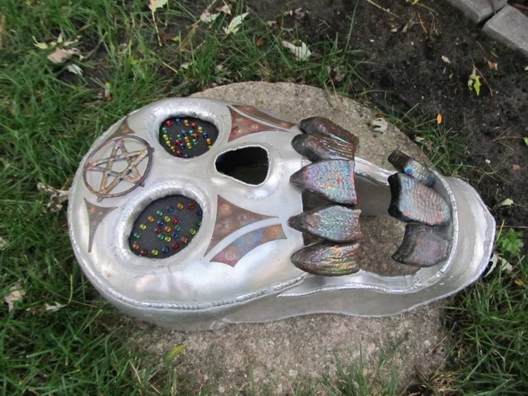 I started out thinking his name would be ( Scars ).....But as I welded and Hammered and Shaped and Formed - He took on the personality of One of My Favorite Rock Band Members....Can U Guess Crue...? I mean Who...??? .100 Thousandth thick Aluminum for his shape - and formed and welded Copper for De...