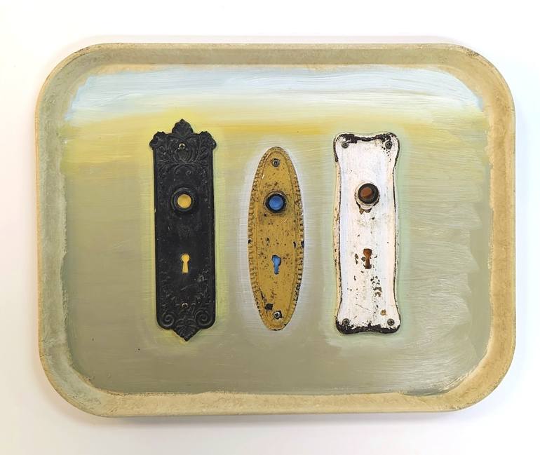 Part of the Highwayscapes collection. Objects from one age (the Victorian Age) have been used to depict the mid-centry modern age - the age of the car. Brass door plates with no handle symbolize "no entry" signs seen on highways and a societal sign of the times for certain races or people of "lowe...
