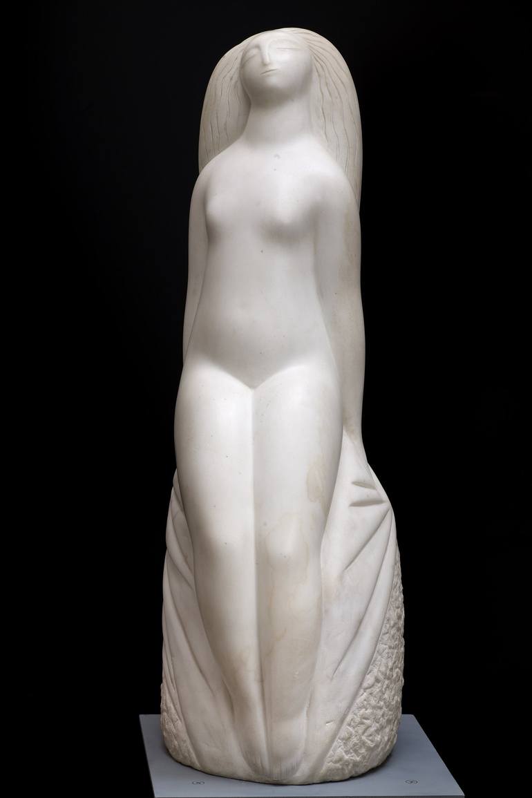 Wonderful sculpture of a young nude figure. The pose of the seated figure in a slight twist contrasts with the sharp forms of the blanket. The smooth, soft shapes play with highlights, seemingly flowing from half-tones back to light, mesmerizing the viewer with the beauty of the alluring young body.