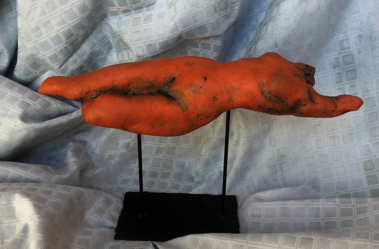 this piece is in terracotta stained with black copper oxide. The ceramic sculpture is elevated on steel base painted in black.I was using my charcoal sketches working on this sculpture.