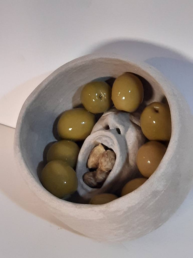 Serie "Humor al plato" Diseño moderno exclusivo en gres cerámico realizado íntegramente a mano y sin molde a alta temperatura. Color de piedra natural. Para ofrecer pequeñas porciones de arte comiendo aceitunas en eventos sociales. 5 x 10 x 10 cm Sobre la artista: Se formó adicionalmente en la ...