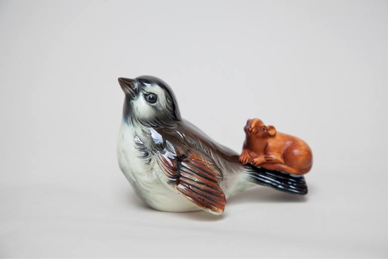 In this sweet sculpture––or juxtapose––a bird carries a small mouse on its tail.