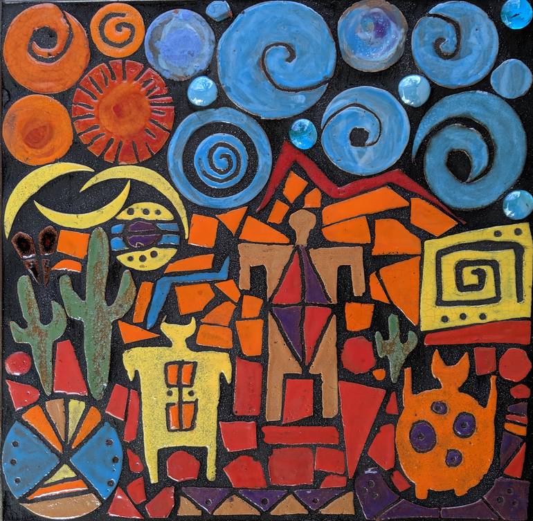 A vibrant, one-of-a-kind ceramic mosaic featuring three anthropomorphic figures, cactus, geometric shapes, and colorful swirls representing the flow and energy of the sky. This piece was created along with several other mosaics after a fire occurred in a gallery exhibiting my work completely gutting...