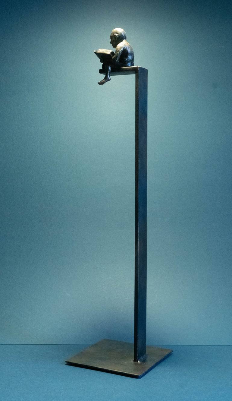 This exquisite sculpture is crafted from steel and polymer clay, skillfully painted to mimic the look of patinated bronze. It depicts a person sitting on the edge of a tall column, deeply immersed in reading the Bible. The minimalist steel column emphasizes a sense of elevation and spiritual pursuit...