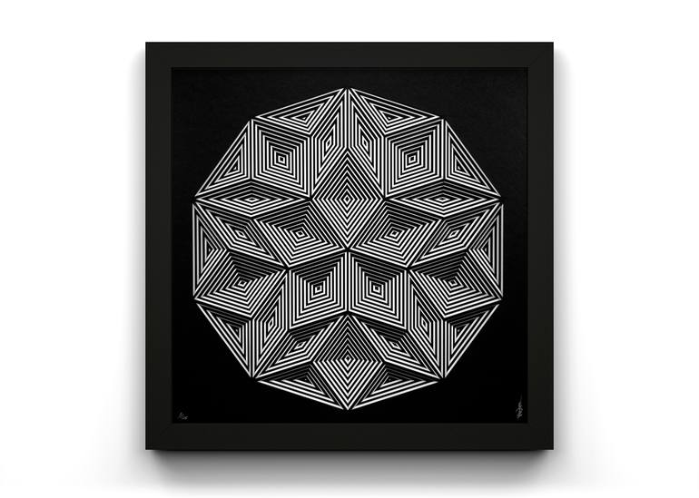 Born in 1978 to an English father and Singaporean mother, Myoshka’s life and work has been significantly influenced by a mix of Eastern and Western cultures. His artworks are created with meticulous and painstaking detail and utilise skills from a number of visual disciplines, combining traditional techniques with contemporary manufacturing processes. Myoshka’s oeuvre is driven by balance and contrast – the artist re-appropriates symbols and sacred geometric shapes from religious contexts such Buddhism and Islam. For each element of Myoshka’s work, one finds its opposite closely integrated, allowing the interaction of negative with positive, the dialogue between light and dark and the tension between disruption and harmony. Within each artwork a powerful optical effect is created as the artist appropriates and masters a core symbol or element. He concedes that creating these intricate, highly detailed patterns and forms is a meditative process.