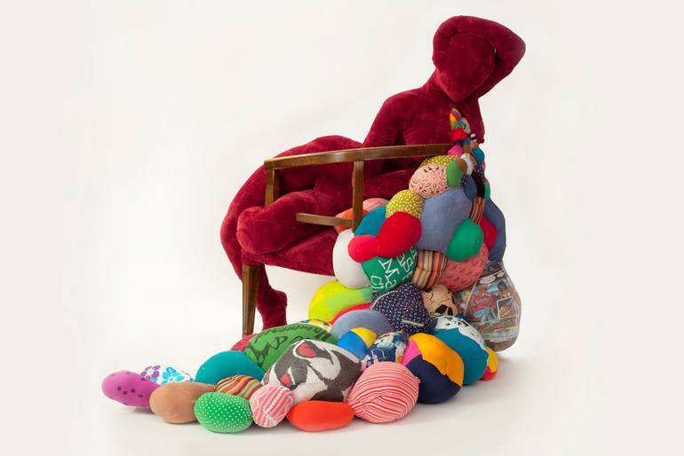 Hoda Zarbaf is a Toronto-based multidisciplinary artist, who has ventured through a variety of materials, techniques and literature to make narrations of intimacy and the complex boon of being a woman. Hoda was born in Tehran and received a BFA in Painting from the University of Tehran. In 2008 she relocated to Canada and completed an MFA at the University of Windsor. These days, Hoda is using recycled textiles, pre-owned clothing, old toys and found objects to make figurative sculptures. The use of various old crochets, used socks or pre-owned T-shirts in her work – along with traditional folk practice of felting and patching – brings a palpable level of intimacy to these sculptures. This correspondingly extols the conceptions of memory and past, which have been constant infatuations of the artist. The displayed notion of “the past” is further strengthened by engaging the absence of the pre-owner/wearer of these garments. Hoda seeks to achieve a layering of opposites alongside each other, much like how she persistently relates to these self-contradictions. Chaotic stitches that create unity while negating perfection; old furniture that create the impression of stability and permanence, despite the fragility of the adjoining soft figures; and even the bright colours that constantly fight the spookiness of the tumor-like ooze, are all examples of the display of dichotomies. Above everything else that happens in Hoda’s work, the woman is always in the center and in solitude. The woman must deal with the heap of sentiments: memory, pain, pleasure, sexuality or self-obsession. Hoda shows these women in different roles or states of being; whether she’s vulgar, maternal or cartoonish, she is nevertheless engaged in a lively act of releasing. And this sacred act is what defines her and puts her in a position of reverence. Displaying this womanly process of release and detoxification – whether it’s the act of child bearing or expressing pain and joy – has always been Hoda’s fascination about women, and she has tried to delicately express it in her most recent collection “soft souls”.