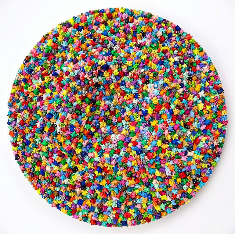 18" diameter, round shape, Acrylic on ceramic on wood The work has many different topographical features and is visually striking. Each pig figurine measures 0.5" x 1" x 0.5". All of the pigs are made out of ceramic. Each pig is handmade, a mold was not used because it is a meditative practice of h...