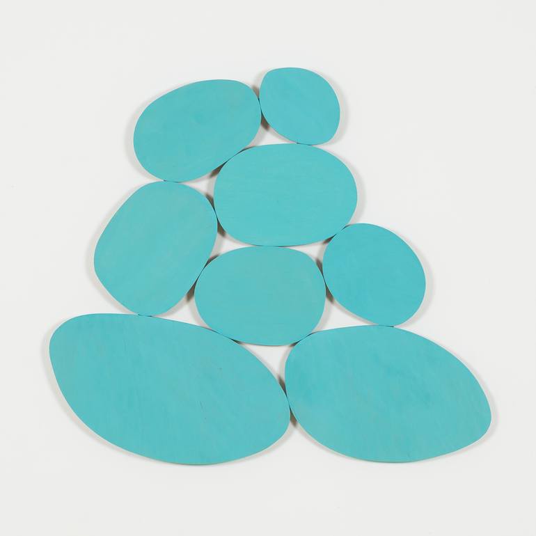 Cut wood (maple veneered ply) rounded shapes of varying dimensions, each 1/4" thick, assembled into a stack. Painted directly on wood a rich bright aqua (blue tending towards green) with velvety matte finish. Some wood grain is visible through the color. Attached to framework on back which is about ...