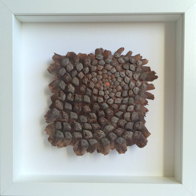 Nature provides us with complex and beautiful forms and I like to take some of those and give them a human touch by disposing pieces to make different compositions. In this piece I am using pinecones, deconstructing them and giving them an other rhythm to meet my aesthetical expression.