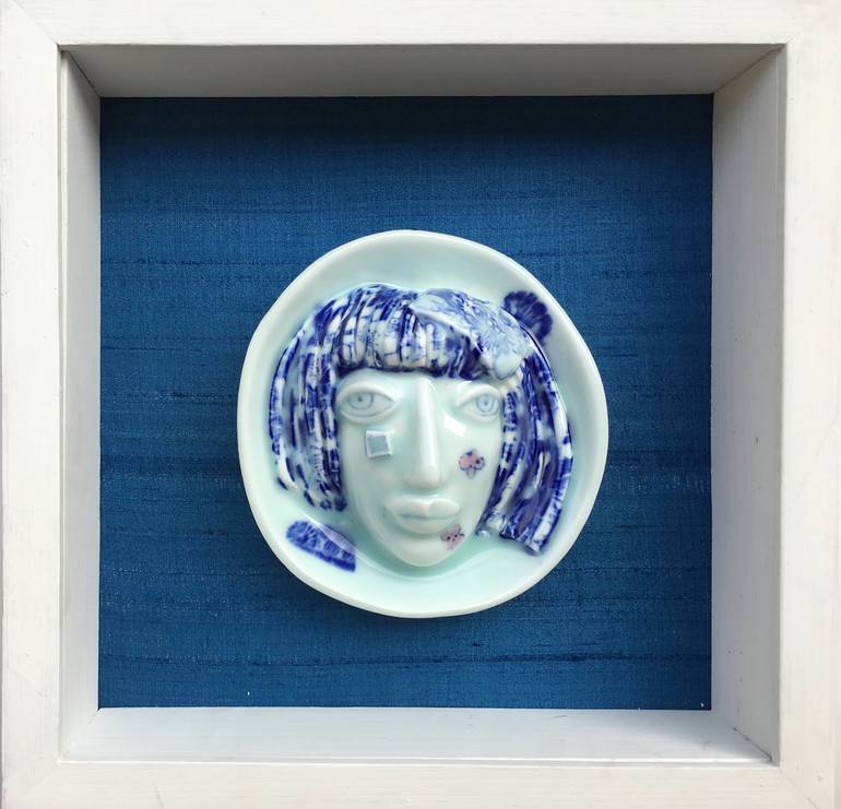 Handcrafted in porcelain with application of Celadon glaze and underglaze painting. A unique piece of art, fired at 1300 degree C. The art work comes with an optional matt finish white wooden box frame and blue silk background. Dimension with frame - 12 inch(H) x 12 inch(W) x 3 inch (Depth)