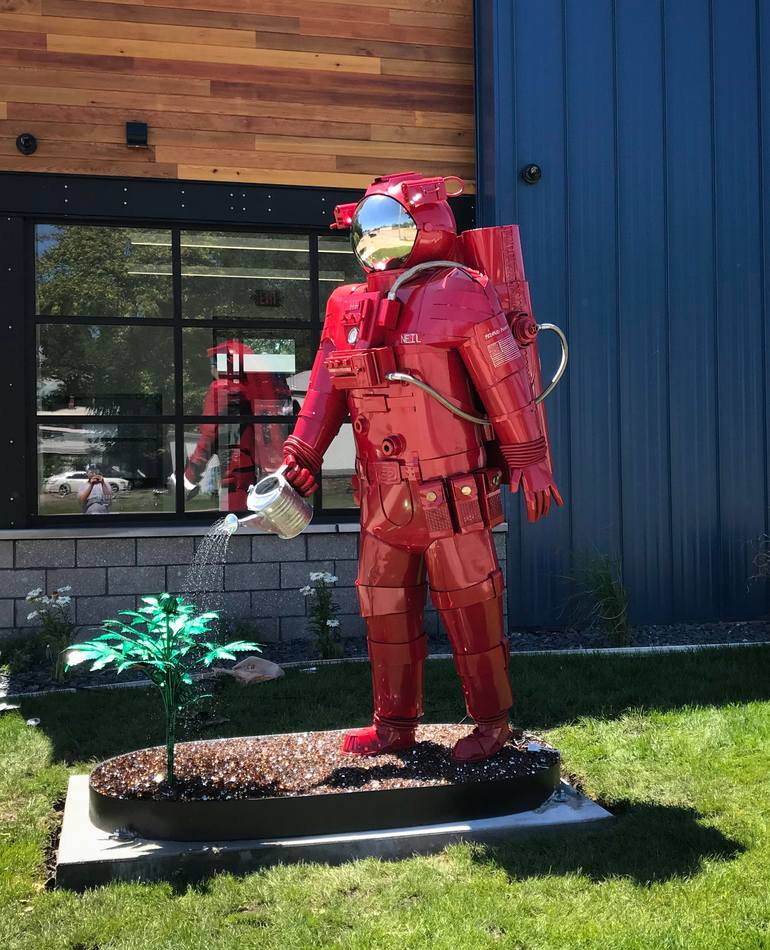Pioneer' is a large astronaut sculpture constructed from stainless steel finished with a red powder-coat. The piece stands 10' H and is mounted to a reservoir base, which circulates water to a watering can that waters a metal marijuana plant. The reservoir is covered with expanded metal and reflecti...
