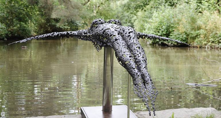 Welded steel sculpture of a female figure, capturing the moment just after she dives backwards from a ledge. The entire sculpture is made entirely from punched steel disks individually hand punched and meticulously hand welded together by the artist himself to the correct forms and proportions. Th...