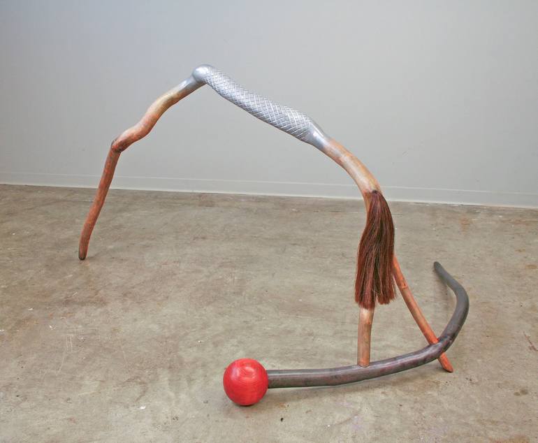 When the bark is carefully stripped from tree branches, there is a resemblance to the way skin articulates details of the human figure. This construction in maple and turned elm is made of four separate sections. The painted silver section contains an engraved pattern or "checkering". A ponytail ...