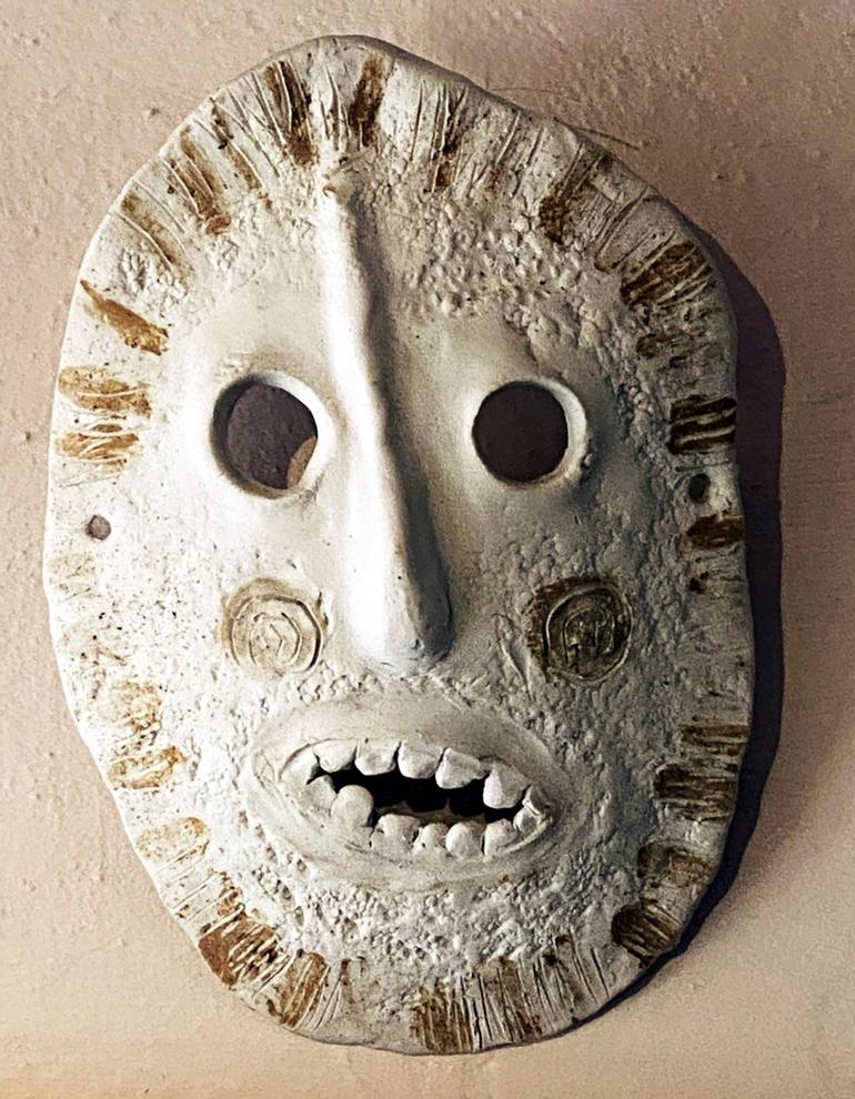 From a series of over 60 masks. I call them life masks because often I use my own face for the basic mold. This is a mask of Homer, the Greek bard. Each mask is stung with nylon with small holes on the sides so it can hang.