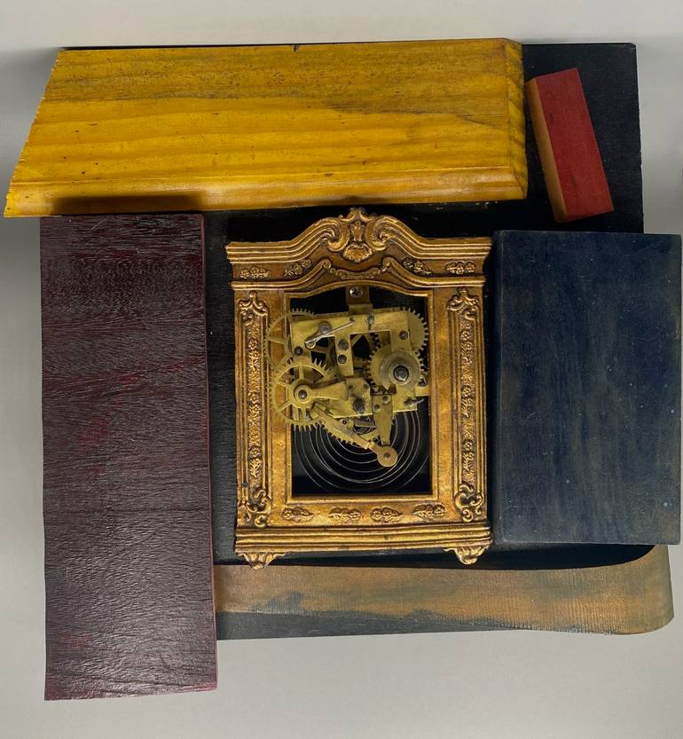 I was interested in the play between the stained repurposed wood and the gold guilt frame. The frame was begging for a head shot portrait, and I happened to have the clock workings on my desk. I noticed I could visualize a face in the mechanism. A small wood relief sculpture by Linda Atkinson, fea...