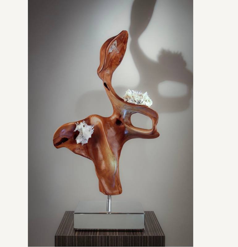 Materials: Teak Wood, Lumerian Quartz Crystal, High Polish Stainless-Steel Base, LED Light from The Light Within Collection