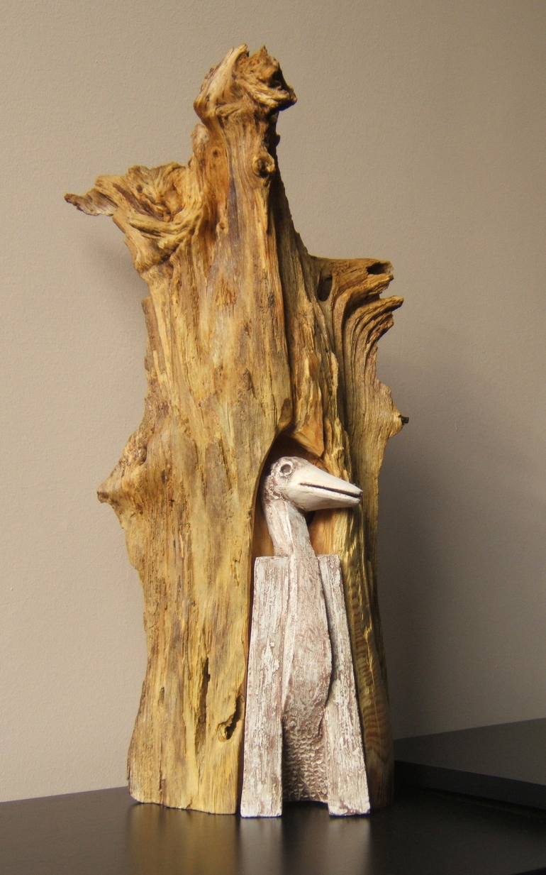 My works depicting avians aim to draw attention to the protection of animals’ original habitats. My frightened birds or avines cling to their homes. Pine wood and glased white fireclay.