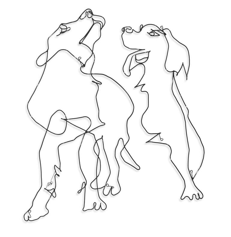 This is a 32 X 37-inch wire wall sculpture of two puppies. It is made out of 9 gauge (about 3 mm thick once powder coated) low carbon steel wire that I bend by hand and weld, then powder coat gloss black* with an extremely durable, weather resistant material that makes it suitable for outdoor instal...