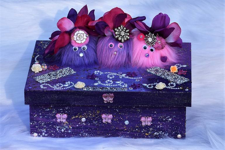 This is a handmade wooden trinket box that features three pink and purple softie puffs! The eyes look realistic, and this box opens to hold jewelry or other smaller items inside. This trinket box is hand-painted with various shades of lavender, purple, violet, and pink shades of watercolor paint. A ...