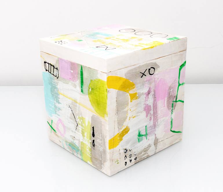 Colorful Contemporary abstract art object. One of a kind Hand painted abstract wooden box. Decorative abstract art sculpture. Media: Acrylic on wood. Protected with acrylic gloss varnish. Size: 7,8" x 7" x 7" (20 x 18 x 18 cm). Title: Quadratino 03 Support: wood Style: Contemporary Subject: Abstrac...